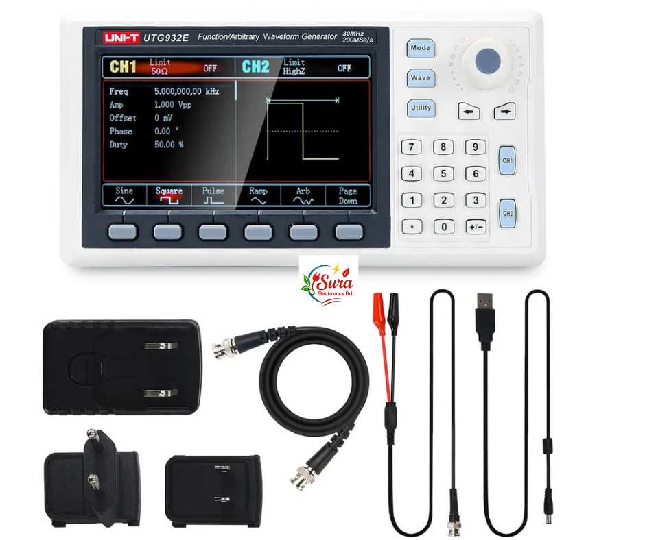 UNI-T UTG932E Function Signal Generator is a highly advanced, professional-grade waveform generator designed to deliver exceptional performance for electronics design, testing, troubleshooting, and educational applications. With its impressive 30MHz bandwidth, dual-channel output, and versatile waveform generation capabilities, this model stands out as a reliable and powerful tool for engineers, technicians, lab professionals, and electronics hobbyists who demand accuracy, stability, and ease of use. Whether you work in R&D, repair labs, training institutes, or manufacturing, the UTG932E provides all the essential features required to generate clean, stable, and customizable signals for comprehensive circuit analysis.